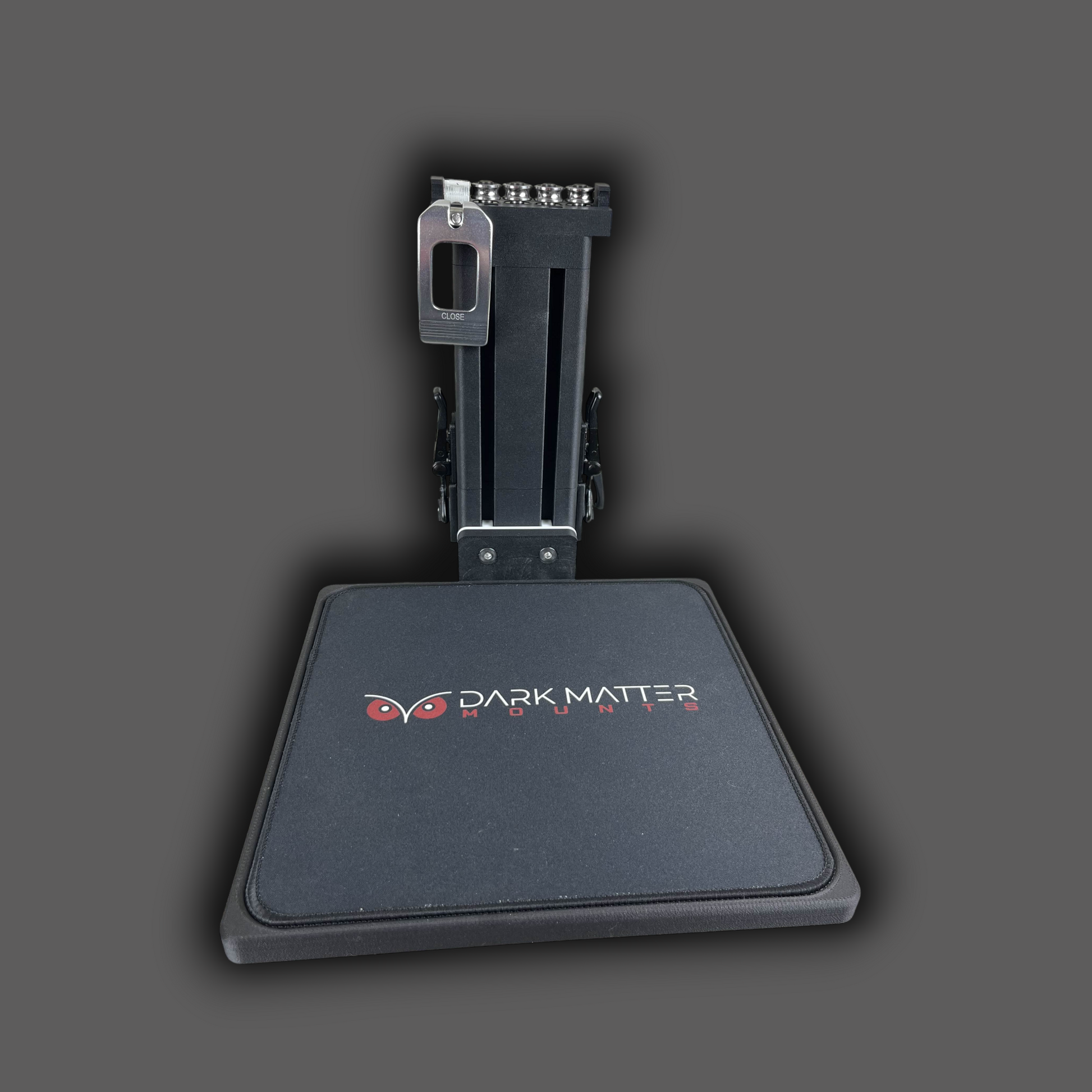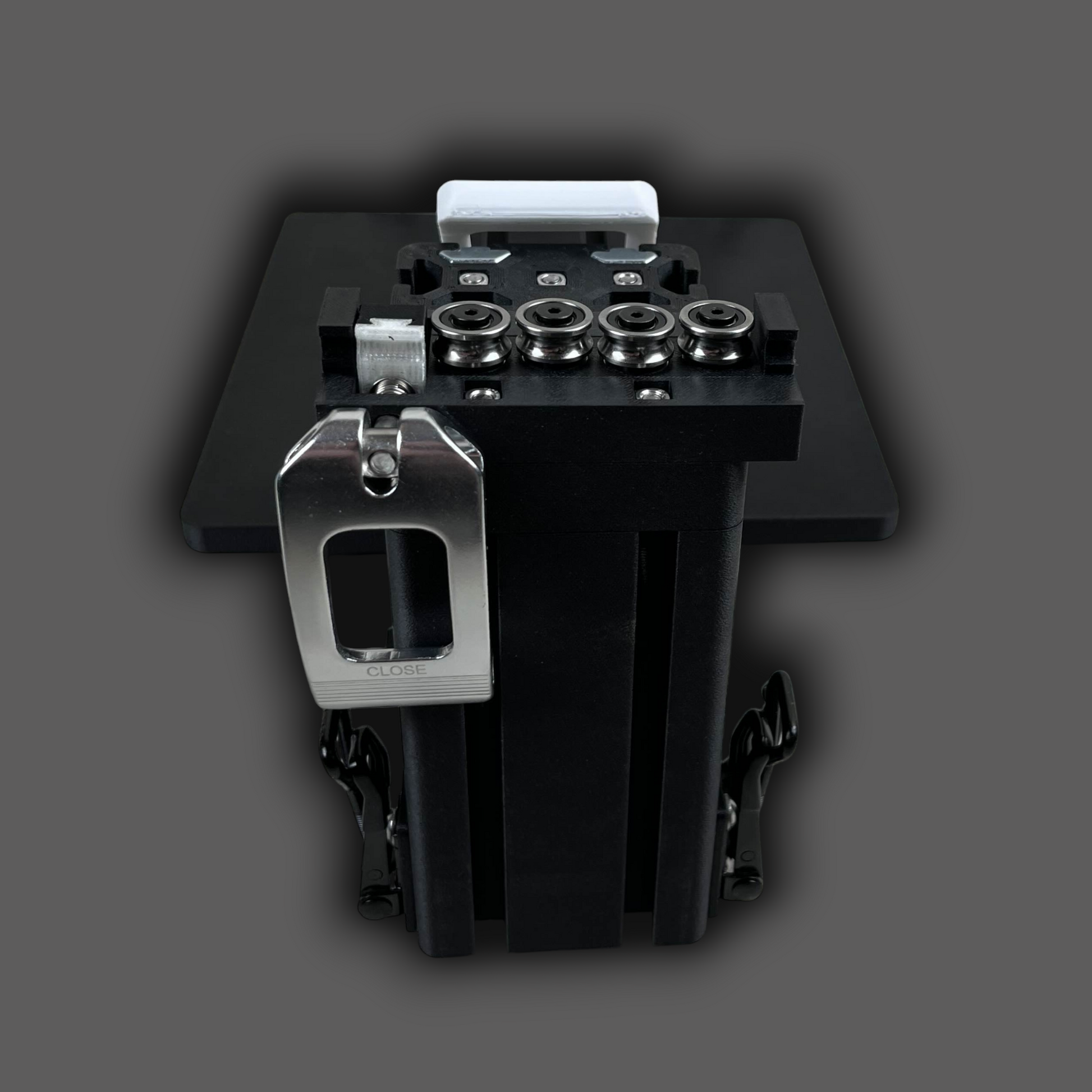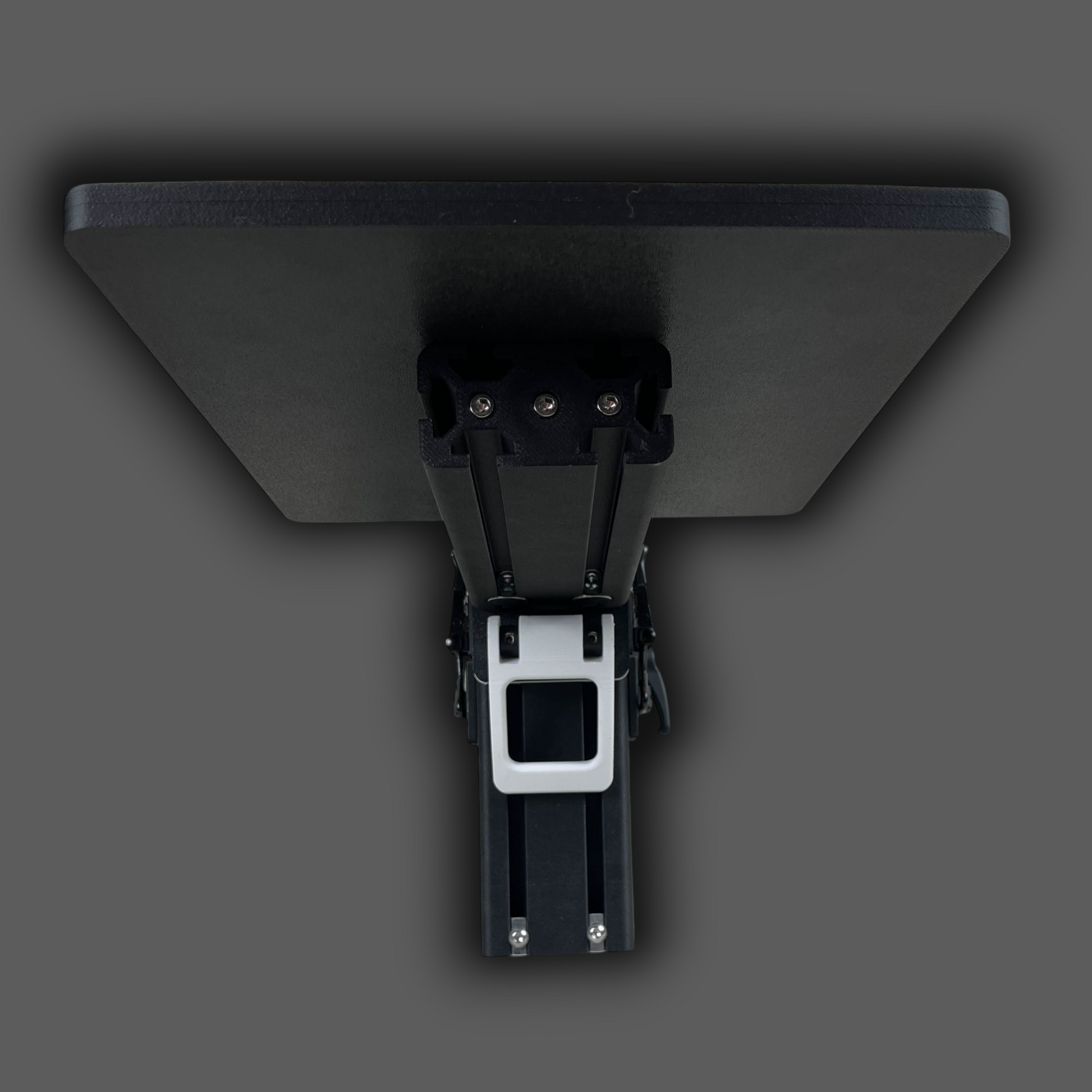 This product is a 3D printed desk mount with 180° Folding Metric 4080 Extrusion (compatible with desk rail mounting only). This is very useful for wide mounts like a Mousepad/Keyboard Tray because with it folded back you can push multiple Rail Mounts much closer together off to one side when not in-use. Filament used for this part is Bambu Lab PETG-CF, which is carbon fiber reinforced PETG, and it is printed at 100% infill for maximum strength and rigidity. The white parts are made with Igus I150 filament to help reduce wear between moving components. This kit includes 1 top plate 18mm thick, 2 vertical 138mm extrusion pieces (hinged between them), 1 horizontal 206mm extrusion piece with countersunk anchor holes (Keyboard/Mouse Tray, Joystick, Throttle, etc.) and Horizontal Extrusion Sled for vertical height adjustment. All assembly hardware is included with this kit (M6 screws/t-nuts and M8 anchors/screws/t-nuts/clamp lever). Rail Guide and Mousepad Tray (shown in pictures) are sold separately.